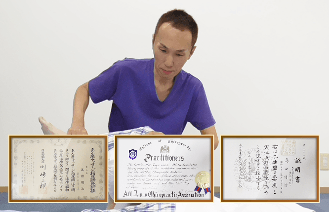 院長は、国家資格である『あん摩マッサージ指圧師』をはじめ、さまざまな教育課程を経て身体を改善する知識と技術を身に着けています。正しく丁寧な施術を行いますので、身体の悩みは安心してお任せください。